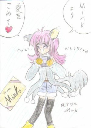 題材は「フロスティ・キス」のCMで、抽選でバレンタインデーに銀ギツネのMinkちゃんからカードが届くという設定です。某掲示板であすかさんが募集していた企画に応募したら、いただきました。こんなかわいいMinkちゃんからバレンタインにチョコが届いたら、誰だってときめいちゃいますよね〜〜〜〜♪