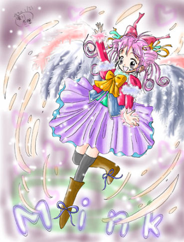 華やかなステージで可愛らしく歌うMinkちゃんのイラストですぅ〜〜〜〜〜〜♪ Minkちゃんの背中に、天使の羽が見えますね〜〜〜〜♪ ということは、これはモッくんヴィジョンによるMinkちゃんなのでしょうか? それとも、WANNA−BEの起こした奇跡?? そういえば当HPでは、歌うMinkちゃんのイラストは意外にも初めてですね〜〜〜〜〜♪ Minkちゃんといえば、普段はハンドフリーのマイクをよく使っていますが、こっちは普通のマイクです☆ 普通のマイクで歌うMinkちゃんもまた可愛らしいですねっ♪ このイラストは、全くのご好意で突然頂いちゃいました〜♪ ありがとうござい真帆子〜〜〜〜〜♪ ハートマークの演出もまた、Minkちゃんの可愛らしさにぴったりですねっ♪ 衣装は夏っぽい爽やかな衣装♪ 「Velvet
