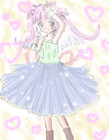 またしてもステージで元気一杯に歌いまくるMinkちゃんのイラストですぅ〜〜〜〜♪ 今度も背中に天使の羽が見えますぅ〜〜〜〜〜♪ 天使の羽は、WANNA−BEの奇跡なのか? いやいや、Mink(みんく)ちゃんの魅力そのもののあらわれなのですぅ〜〜〜♪ というわけで、またしても唯川さんにステージのMinkちゃんをご好意で頂いちゃいました〜〜〜♪ ありがとうござい真帆子〜〜〜〜〜♪ 今回はハンドフリーのマイクを使って歌ってますね♪ 元気に飛んだり跳ねたりのMinkちゃんの姿をまるで間近で見ているようですね〜〜〜〜♪ 衣装も元気でキュートなデザインで、とっても素敵です♪ やはりMinkちゃんの歌うイメージって、あどけなく元気に歌うっていう感じでしょうか? 頭のおっきなリボンも、とっても可愛らしいですぅ♪ イメージとしては、「百億の月」を歌っているところでしょうか? それとも「DARLING HEART」かな? 客席からの拍手が聞えてきますね♪ またまたMinkちゃんのライブに行きたくてしょうがなくなっちゃいますよねっ☆