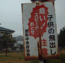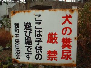 ところで、この公園があったのは、車通りも少ない住宅街の中でした。側を走っている道路も狭く、通行量はほとんどゼロなのですが、「子供の飛飛び出し注意」の看板が…。おそらく、有香にゃんがこんな場所でも車にひかれそうなくらいあぶなっかしいく「や〜〜〜〜ん、有香、車ってよくわかんな〜〜〜い」とかいう状態だったので、「オレにまかせろ」と言わんばかりに、付近住民の方々が町内会に働きかけて設置したに違いありませんっっっ!!!!! また、お嬢様の有香にゃんは犬を散歩させていたと思われますが、「や〜〜〜ん、有香、よくわかんな〜〜〜い」とか言って、犬に野グソをさせていたのかもしれませんっっっ!!!! それゆえの右の看板なのでしょうけれど、有香にゃんにはきっと理解不能…いや、いいのですっっっ!!!! 有香にゃんの必殺技「有香、わかんな〜〜〜い!!!」にて、すべてのおぢさんたちは有香にゃんを許したことでしょう♪ はふ〜〜〜〜〜ん♪♪♪ 臭うじょぉぉぉ〜〜〜〜〜〜(ちゅど〜〜〜〜〜〜〜〜〜ん!!!!)