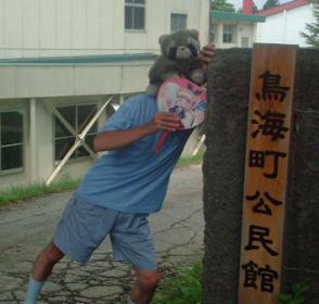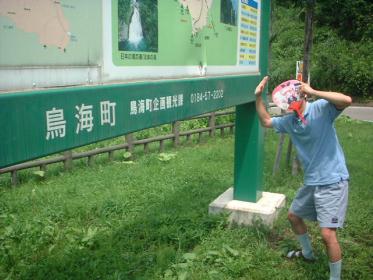 カーナビゲーション上に、ついに「鳥海」の文字がああああっっっっ!!!!???? 思えば、仙台から約3時間、ついに真帆子ちゅわんのおうち、バードミュージックの本拠地へとやってまいりましたああああっっっっ♪♪♪ トンネルを抜けた国道標識が、まさにこの地を、真帆子ちゅわんのおうちであることを物語っておりますぅぅぅぅ〜〜〜〜〜♪♪♪ しかも♪ 我々を歓迎するがごとく、案内板があったので、ついついはしゃいでその前でポーズをとるD氏(爆笑)。ちなみに、大変暑いので、うちわを持っていらっしゃいます♪(ちゅど〜〜〜〜〜ん!!!!)