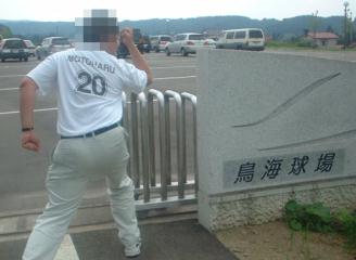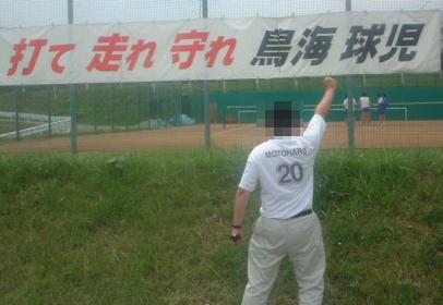 …この燃える野球部の応援幕の前で拳を振り上げてエールを勝手に送りまくっている人はあああああああっっっ!!!??? この背番号20!!! この「MOTOHARU」の文字っ!!!!! 間違いありませんっ!!!!! モッくんでありますううううっっっ!!!!! …って、よくよく見たら、グランドで練習しているのは、野球部ではなくてテニス部では???(那智滝汗)