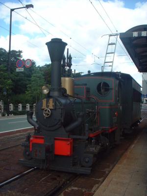 行く途中に伊予鉄道の路面電車がありまして、その軌道を岡蒸気が!!!(笑)