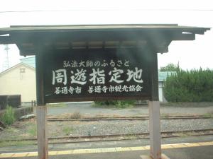 弘法大師、つまり空海の故郷のようでして、駅のホームにも案内が♪