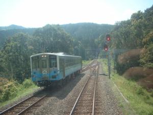 信号場で一旦列車が停車し、まもなく予土線からやってきたJR車両が通過します。