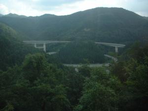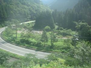 ここは、備後落合駅近くの車窓です。路線の下方に森林が広がるような光景です。