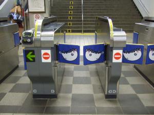 これは下関駅の自動改札機ですが、改札機の扉がふく(※「ふぐ」を下関では縁起をかついで「ふく」と呼びます)であります♪