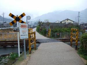 さて、東萩駅まで、元来た道を引き返しました。途中には、警報機の無い踏切(第4種踏切)がありました。二輪車以外通行禁止です。
