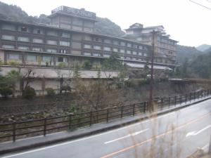 左は長門湯本駅からの車窓です♪ 温泉街らしく、ホテルが川沿いに建ってます♪