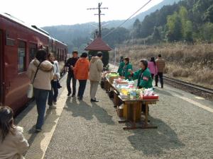 また、ホームでは地元のおばちゃんたちが特産品の即売です♪ 買い物時間もじゅうぶん♪
