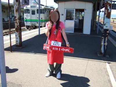 ホームに、あの有名な「いかめし」の立ち売り販売の売り子さんが数人売りに来ていました♪
