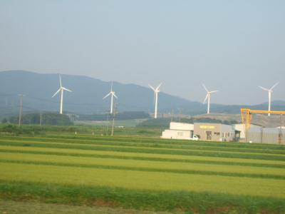 風力発電の風車がいくつも車窓に見えました♪ 風が強い地方ならではの光景でしょうか?