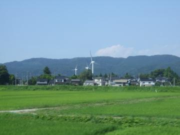 沿線の風力発電の風景です♪ 狩川駅付近、山形県立川町にて、風力発電を展開しているのだとのこと♪