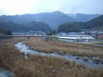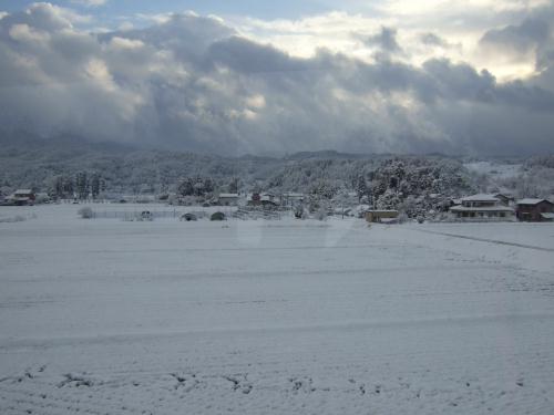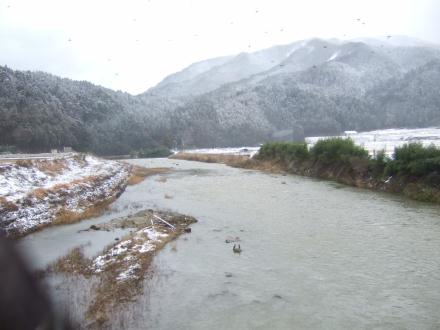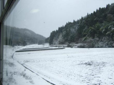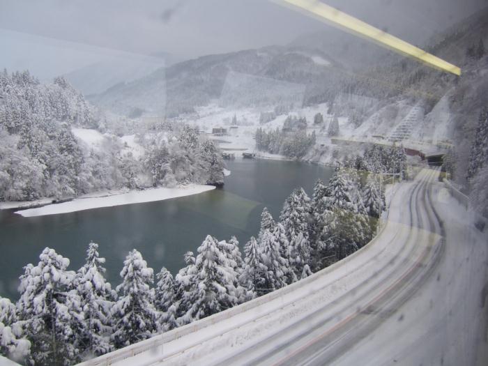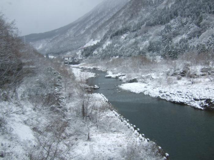 雪が降ったため、車窓は軽い雪景色です。山並みに粉砂糖のように降りかかった雪が絵になります☆