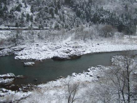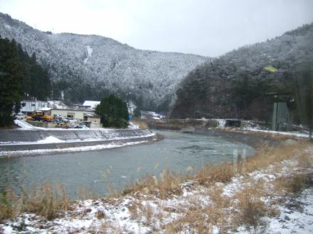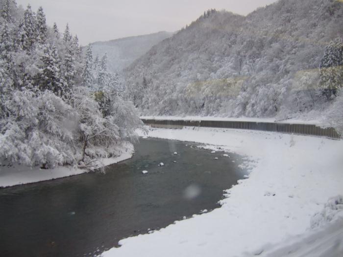 上流では九頭竜川に沿って進みます☆ 雪景色もさらに雪の度合いが濃くなってきます…