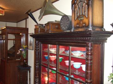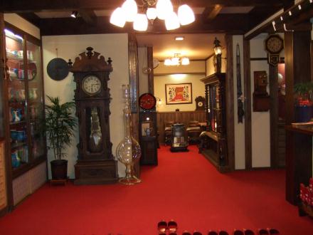 宿に入ると、玄関はこんな感じ♪ アンティークなグッズがのっけからたくさん並び、レトロな雰囲気満載で客の芽…もとい目を奪います♪
