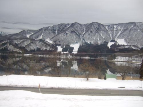 こちらは牟礼駅に近いあたりの車窓です♪ 川と山並みの雪景色がやはり美しい♪