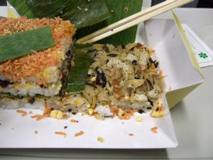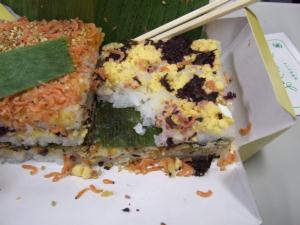 これ、普通の押し寿司とは一風変わってまして、一段目は小エビ(アミ)と白ゴマ、二段目は卵とシソ、