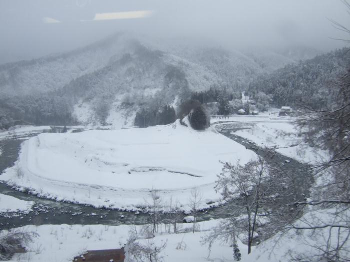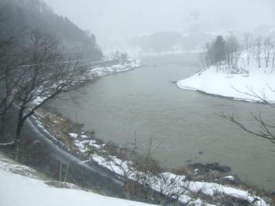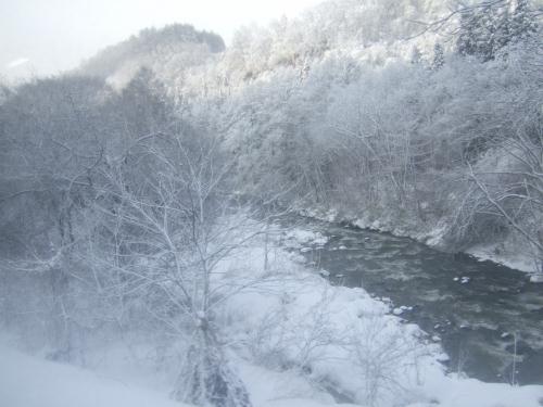関川がグルッとオメガ型にカーブする車窓が雪景色となっており、見ごたえ抜群♪