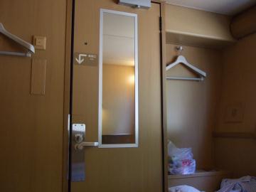 部屋の中からドアの方を見るとこんな感じ♪ ちょっとした棚や、ハンガーが設置されていて、便利です♪