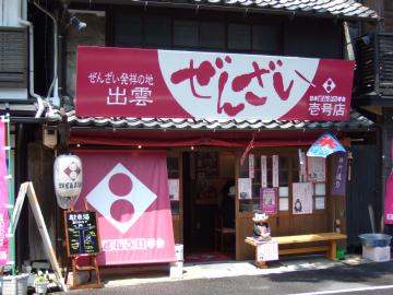 右はぜんざい店。ぜんざい発祥の地が出雲と書いてあり、下のほうには「ぜんざい学会」なる文字もありました。ほえ?
