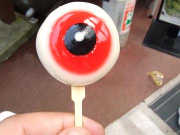 このとおり、目玉おやじを象った和菓子(中に餡子が入った饅頭風のものです)でして、見た目が割りにリアルなので、人によっては食べるのに勇気が要るかも?(爆)